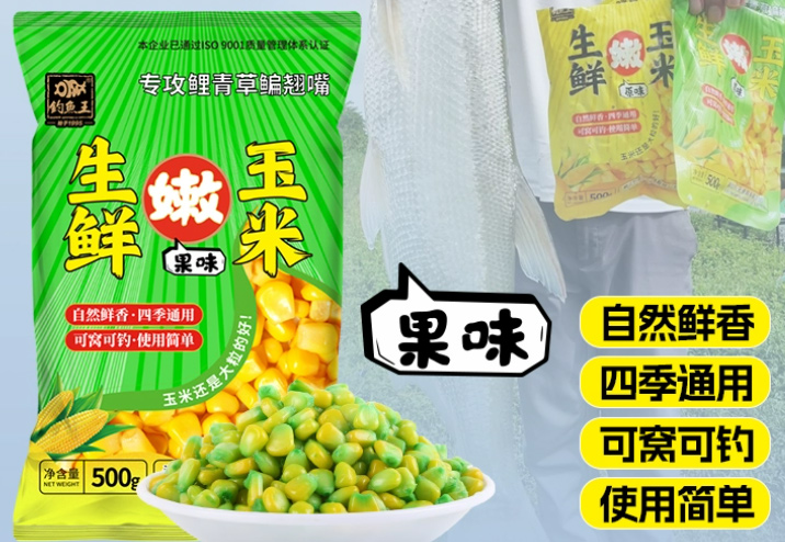 钓鱼王生鲜嫩玉米果味饵料参数、特点、使用方法: