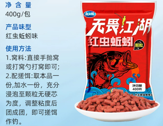 饵料特点:本品精选菜籽粕、膨化大豆、小麦等主要原料,质量添加冻干红虫,蚯蚓粉,融合龙王恨新一代诱食剂,经科学加工而成,颗粒均匀,腥味浓郁,溶散性强,诱鱼快,留鱼久,在各种淡水水域垂钓鲫、鲤、草、鳊、青等均有上佳的诱钓表现。