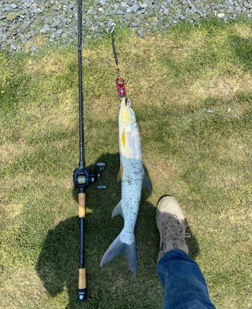 20g魔鬼鱼铁板,抛出去匀收慢收,水草和菱角太多,经常挂。抛了很多竿,忽然感觉感觉饵顿了一下接着杆子传来动静,提竿刺鱼,感觉鱼的力气挺大,海蜘蛛200泄力没锁死,鱼要线出了点线,遛了大概七八个回合,鱼出水,本来以为是翘嘴,没想到是条鱤鱼。也算是解锁了新鱼种。